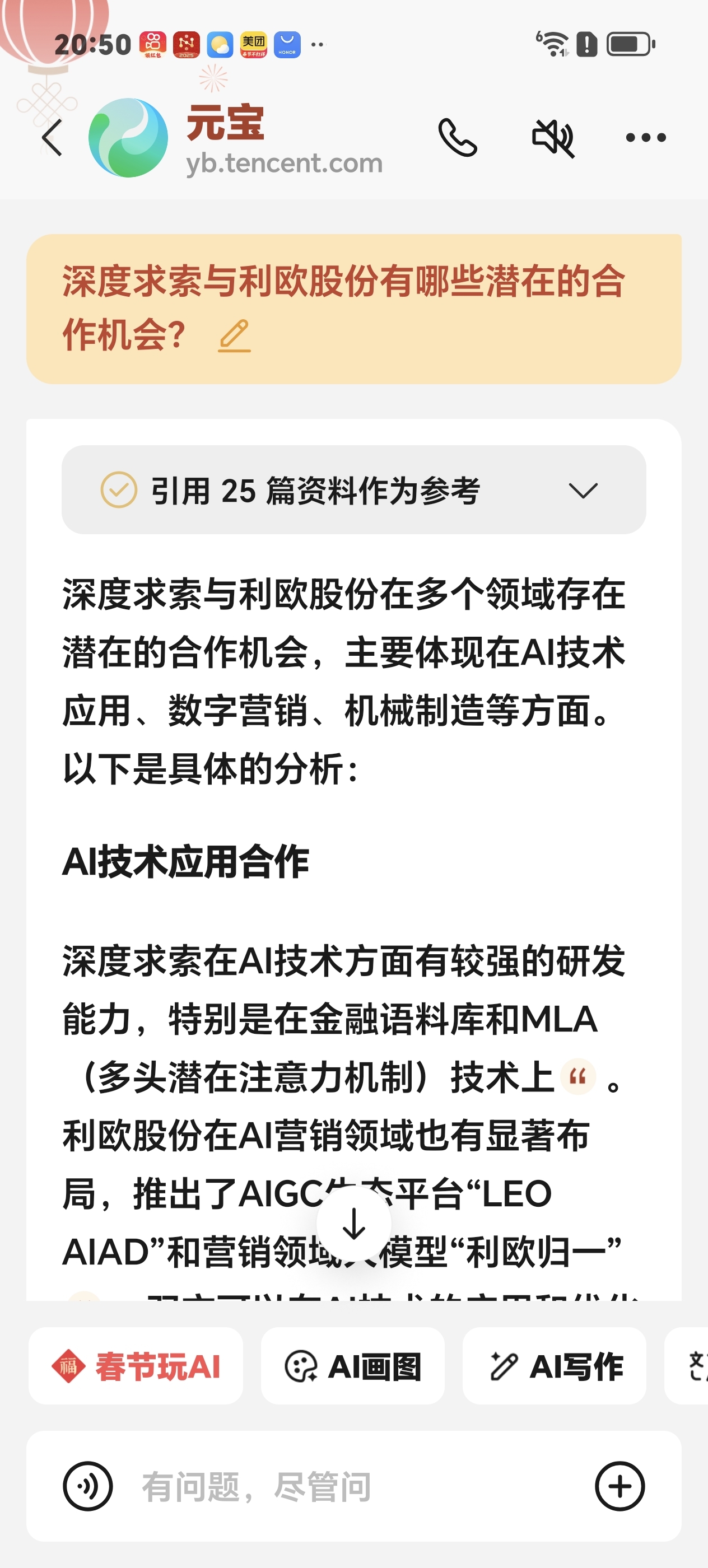 询问了腾讯的元宝利欧和深度探索合作,这是他的回答