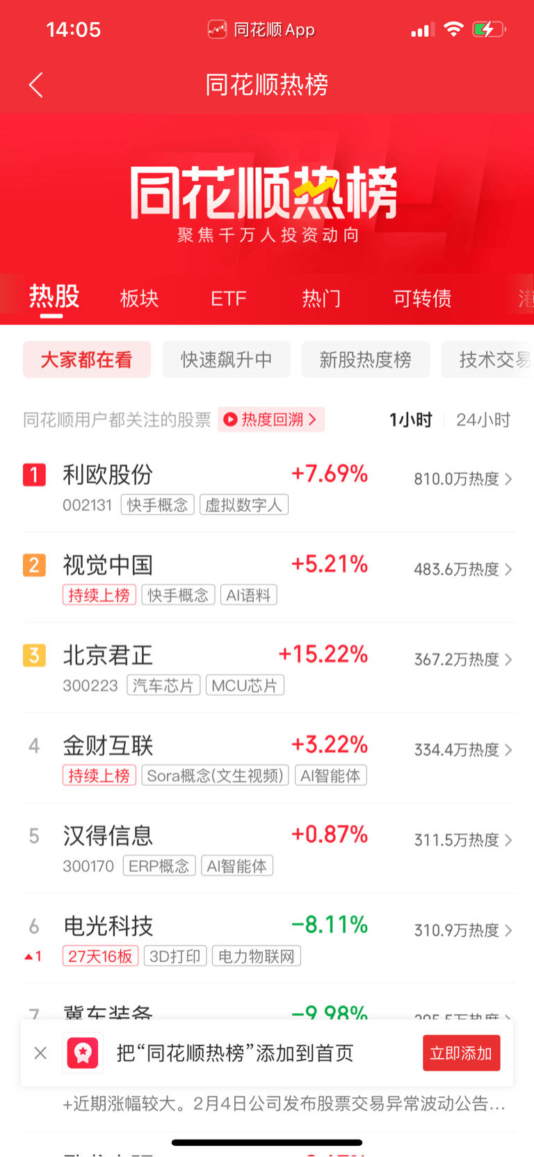 同花顺热度排名第一,比第二名几乎快高出一倍
