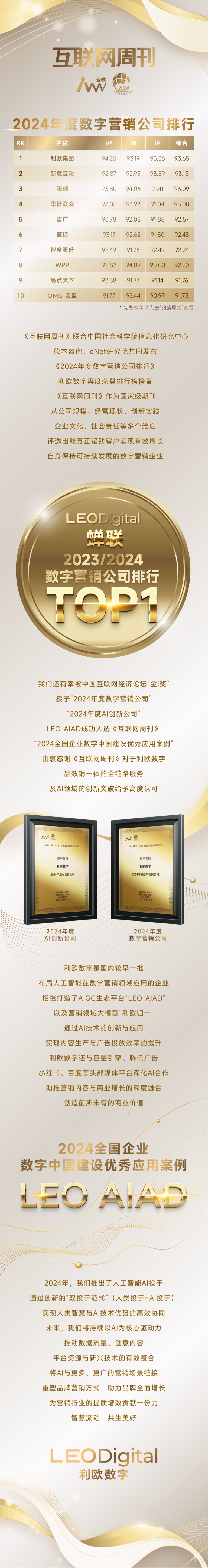 利欧数字蝉联中科院《互联网周刊》数字营销公司排行榜榜首