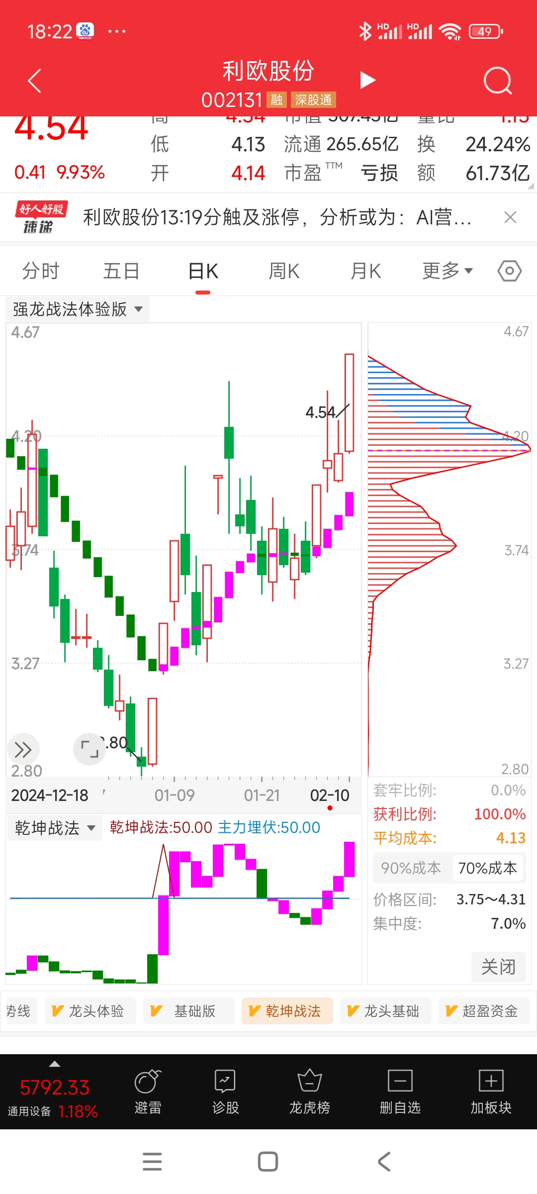 利欧主力成本与市场平均成本一样为4.13元,现在上方几乎没有套牢盘,100%盈利