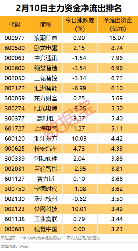 2月10日,71只个股获得主力资金净流入超亿元。利欧股份的净流入额居首,该股涨停,全天成交金额为61.73亿元,主力资金净流入10.04亿元,换手率24.24%。