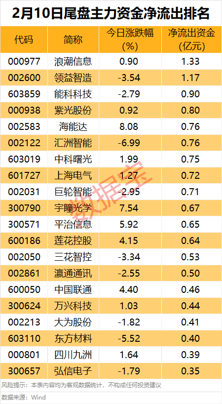 浪潮信息、领益智造的尾盘资金净流出额均超亿元,能科科技、紫光股份、海能达、汇洲智能的资金净流出额居前。