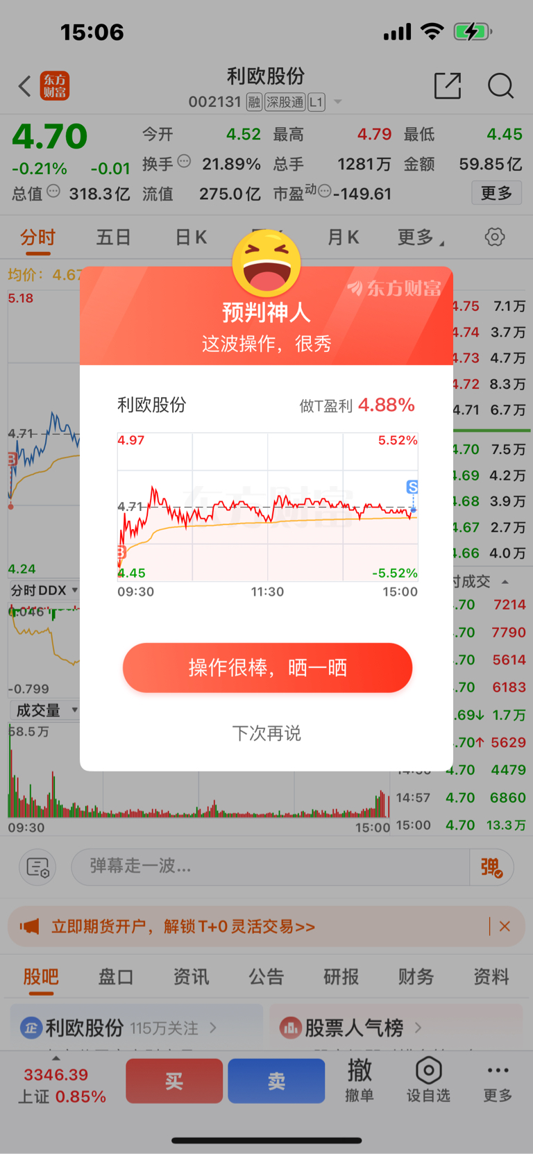 $利欧股份(SZ002131)$ 早盘进尾盘出,只要低开就做T