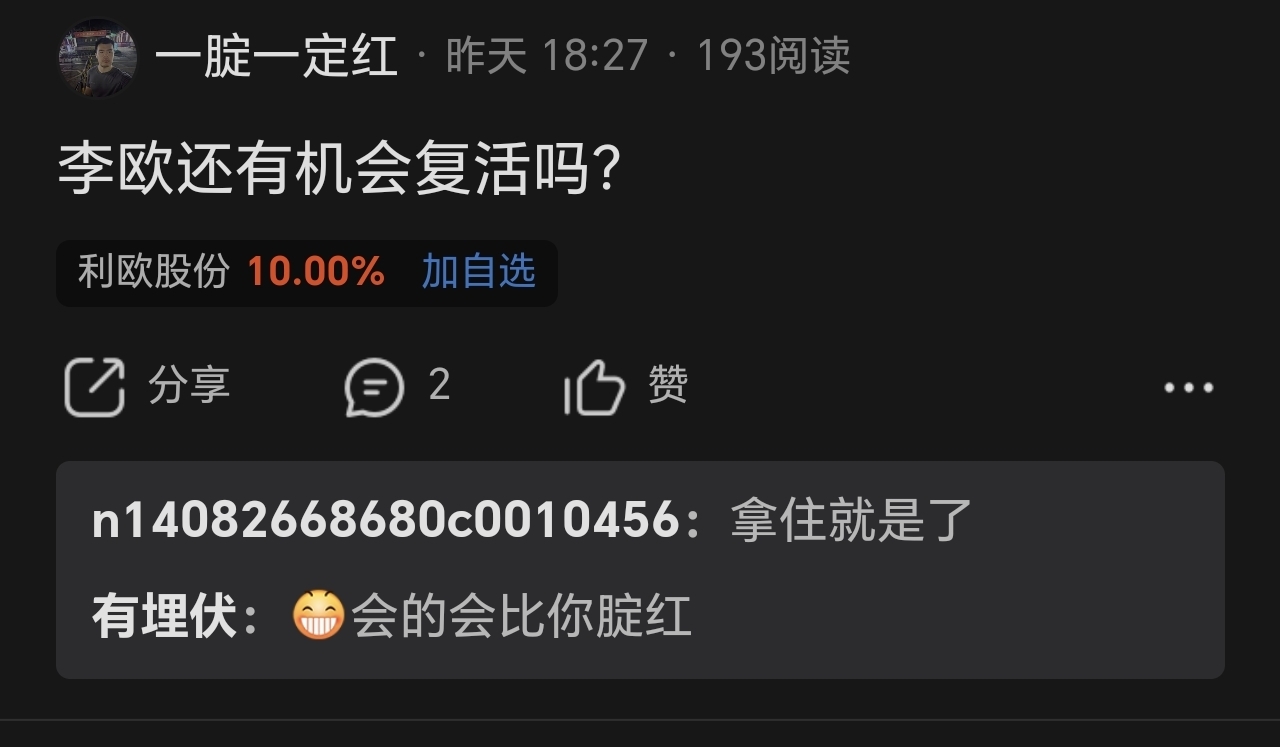 温馨提示: 1.根据《证券法》规定,禁止编造、传播虚假信息或者误导性信息,扰乱证券市场;2.用户在本社区发表的所有资料、言论等仅代表个人观点,与本网站立场无关,不对您构成任何投资建议。用户应基于自己的独立判断,自行决定证券投资并承担相应风险。《东方财富社区管理规定》