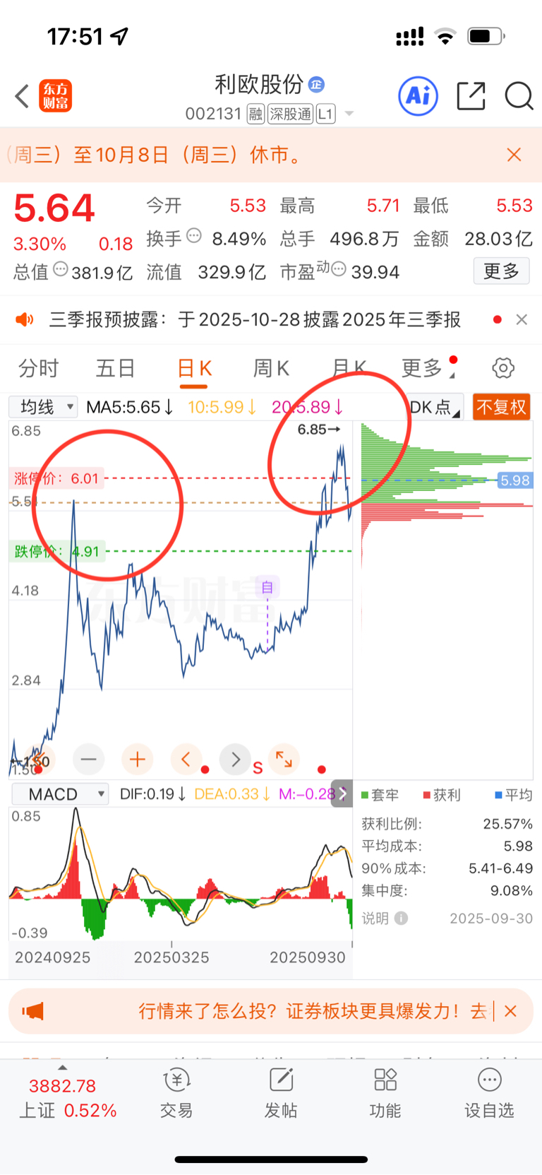 $利欧股份(SZ002131)$ 去年5.91创新高回调到低位2.7附近,今年6.85创新高,现在目前在回调中,个个都想利欧破十,但是用nao想想,盘子那么大,别人为什么要送银入你们袋?所以个人看跌目测回调到3.5附近,再入!!!盘子大几十万股民在,平均1万股一位。目测回调3.5附近,爱信不信