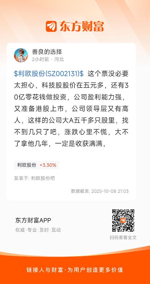 $利欧股份(SZ002131)$ 这个票没必要太担心,科技股股价在五元多,还有30亿零花钱做投资,公司盈利能力强,又准备港股上市,公司领导层又有高人,这样的公司大A五千多只股里,找不到几只了吧,涨跌心里不慌,大不了拿他几年,一定是收获满满,