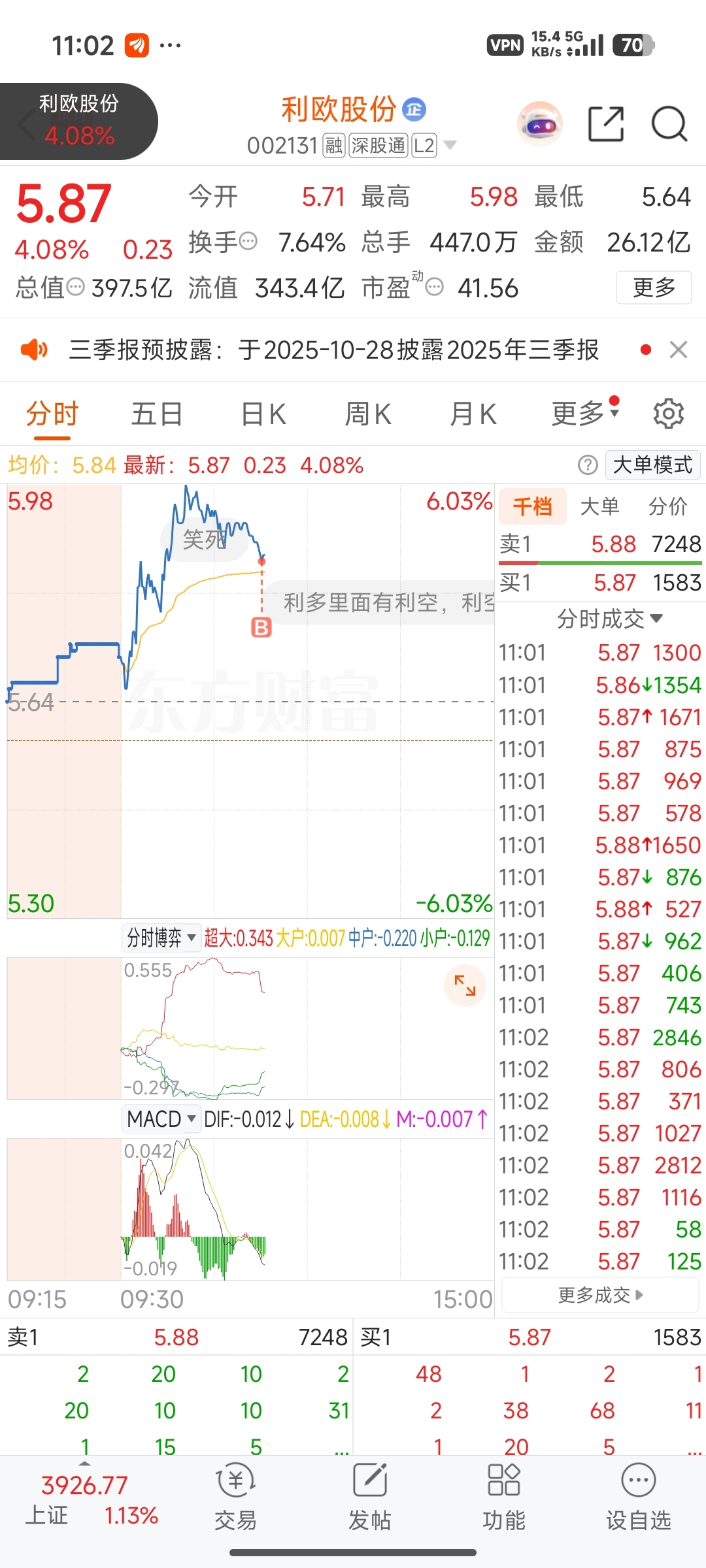 $利欧股份(SZ002131)$ 早盘没赶上,等到了5.86,下不来,只能买了