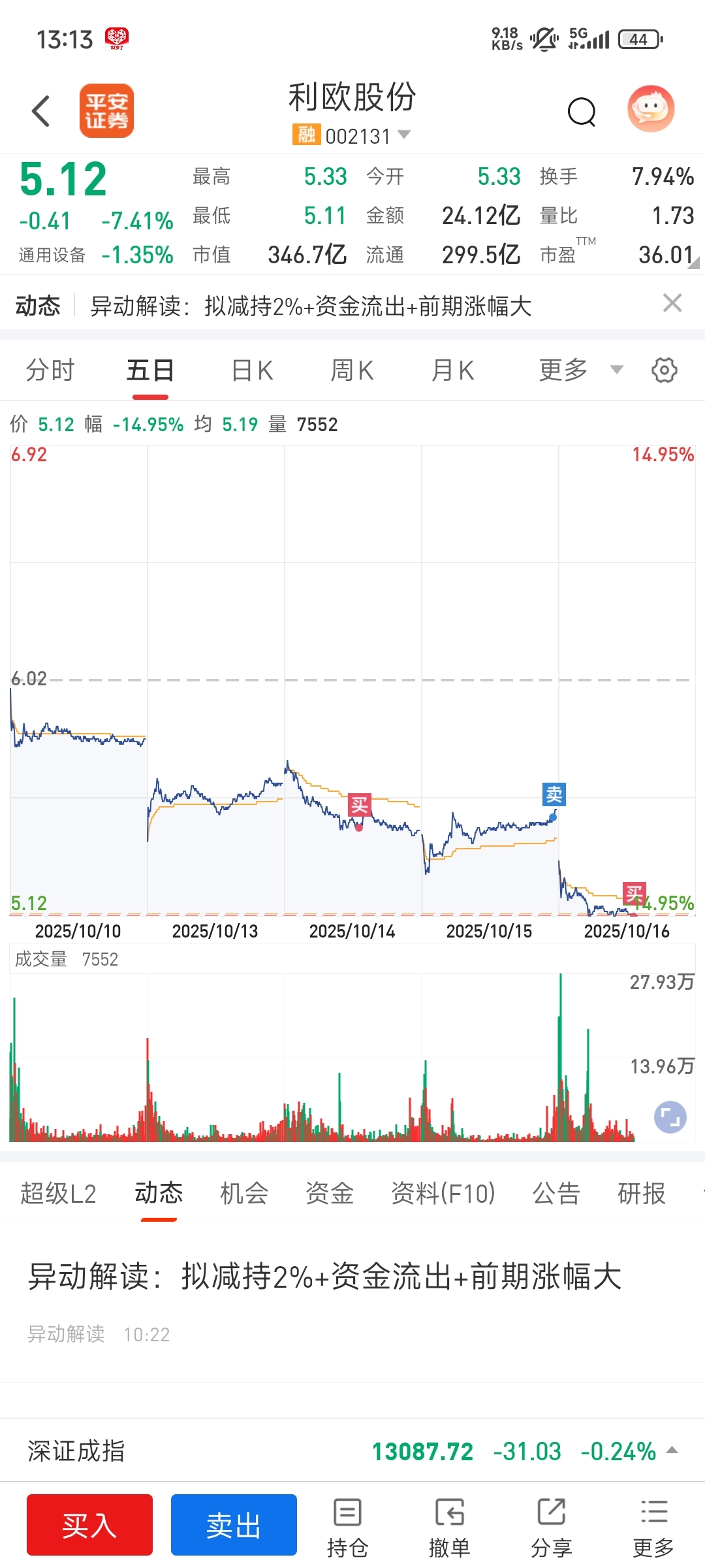 $利欧股份(SZ002131)$ 前天买的昨天卖的,今天再买回来,你们赶快卖吧,我自己一个人吃17厘米大阳线