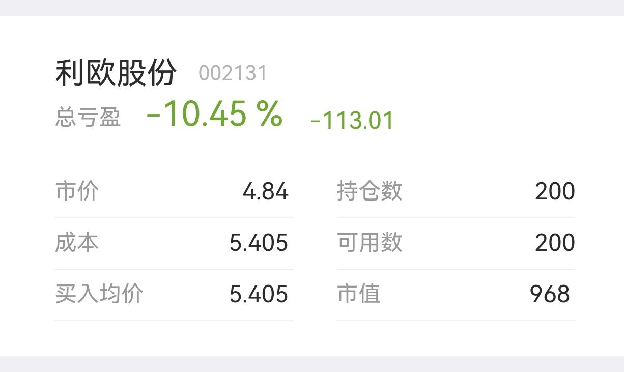 $利欧股份(SZ002131)$ 200股试试,买进就一直跌亏10个点