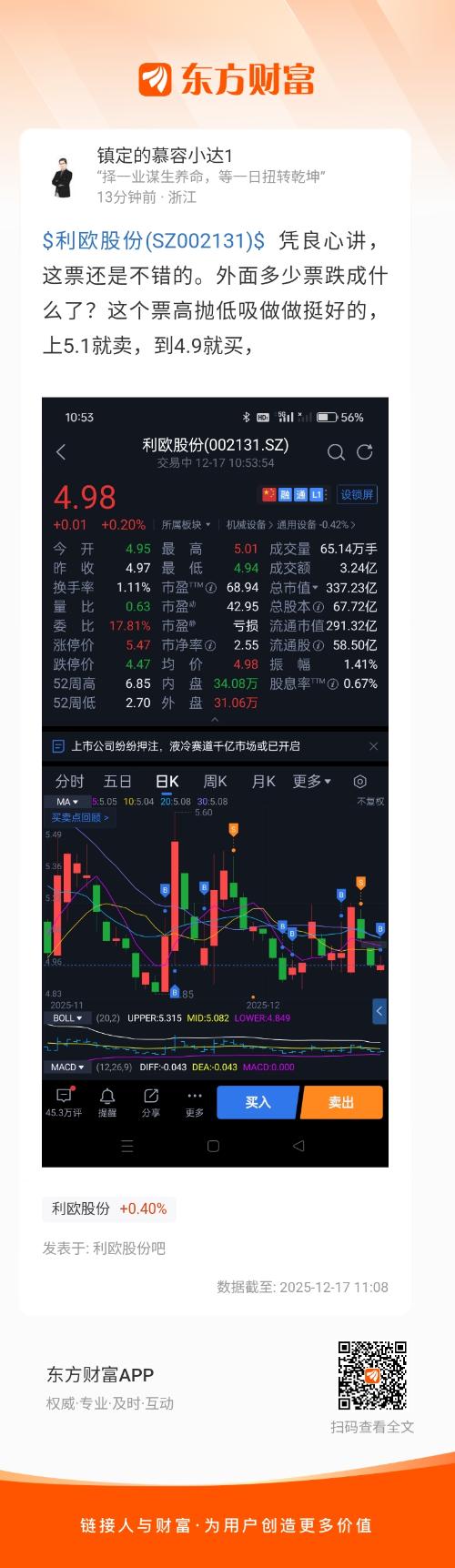 $利欧股份(SZ002131)$ 凭良心讲,这票还是不错的。外面多少票跌成什么了?这个票高抛低吸做做挺好的,上5.1就卖,到4.9就买,