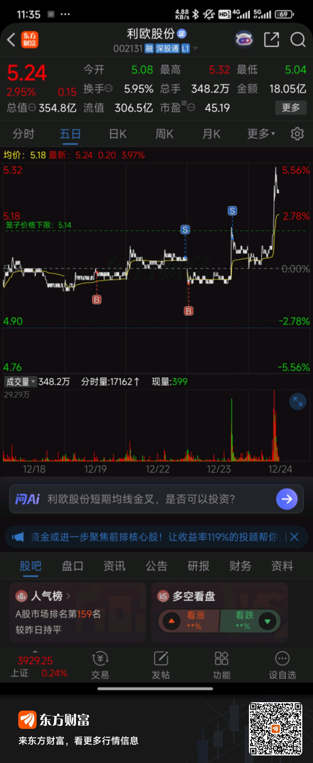 $利欧股份(SZ002131)$ 早上挂买5.04没成交,哎