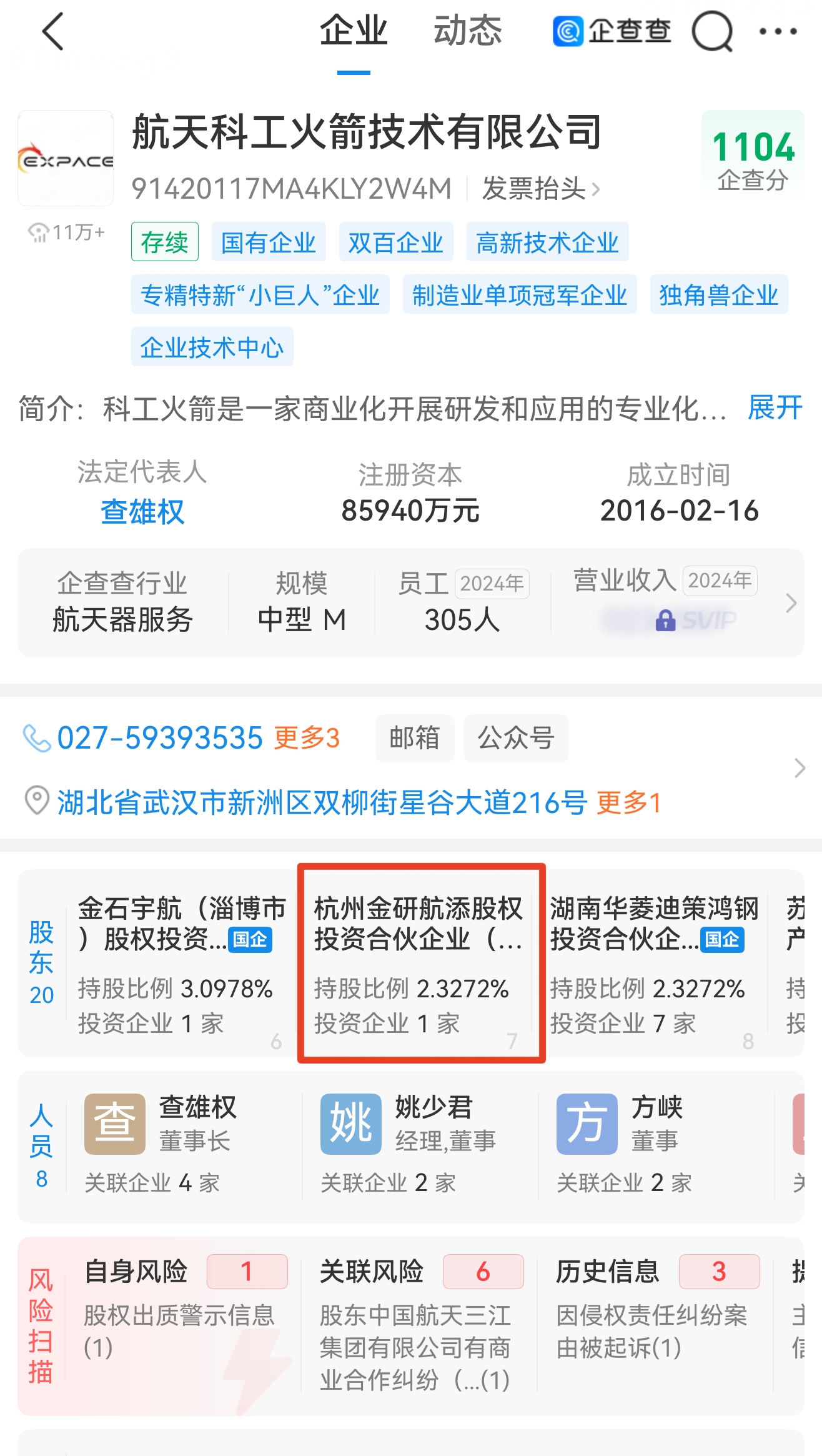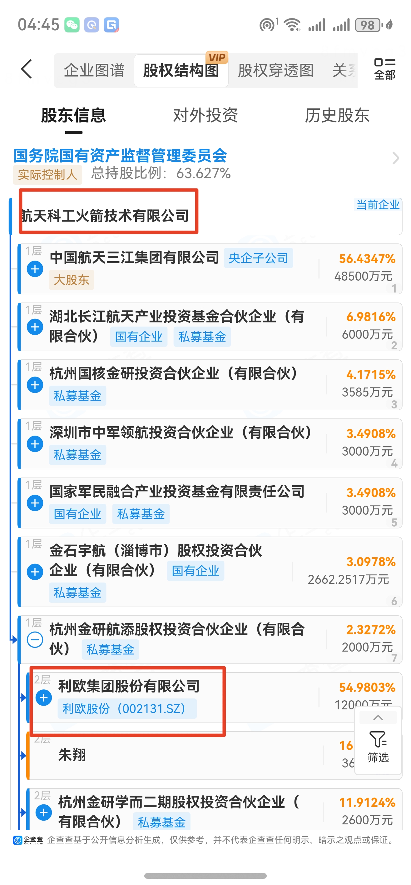 $利欧股份(SZ002131)$ 利欧股份通过子公司杭州金研航添股权投资合伙企业,持有航天科工火箭技术有限公司1.28%股权。