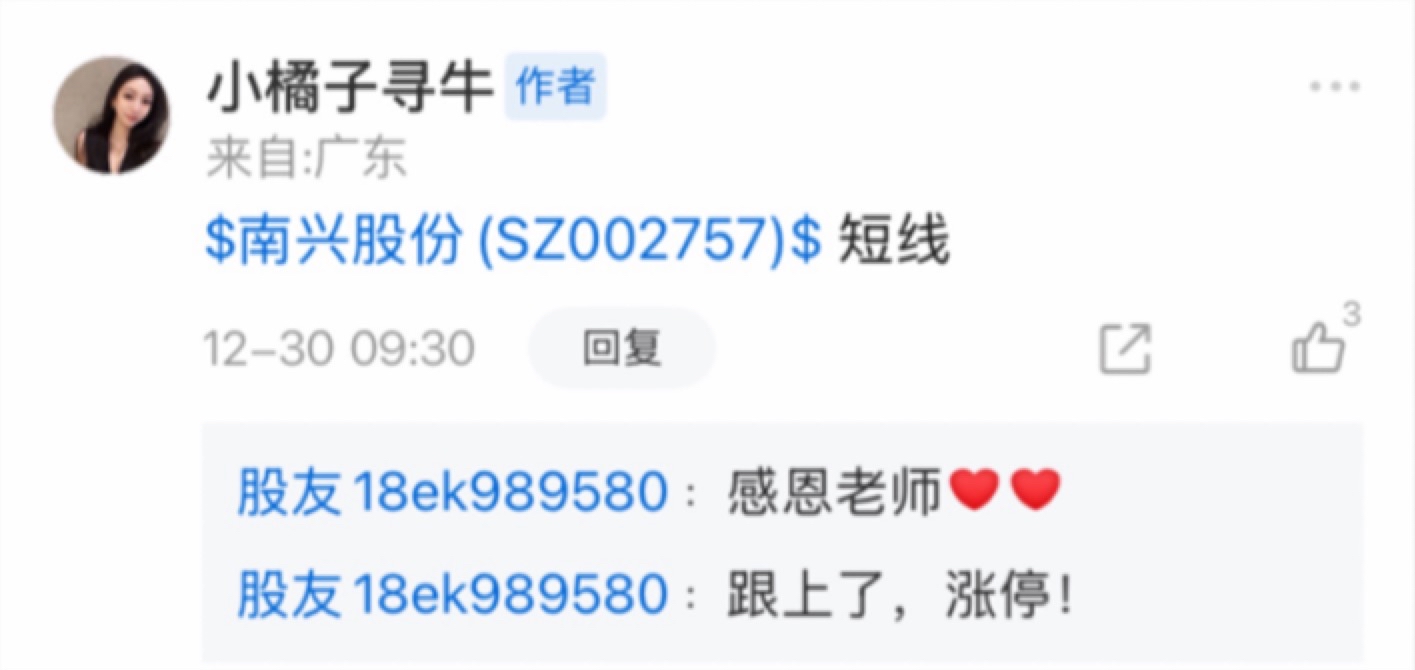 跟上橘子吃肉,顺顺顺,顺财神!2026继续上板$南兴股份(SZ002757)$ 三个涨停板 ,不多说懂的都懂,是不是应该给橘子来一波点赞关注和评论178一起发支持,让橘子看到你的存在!
