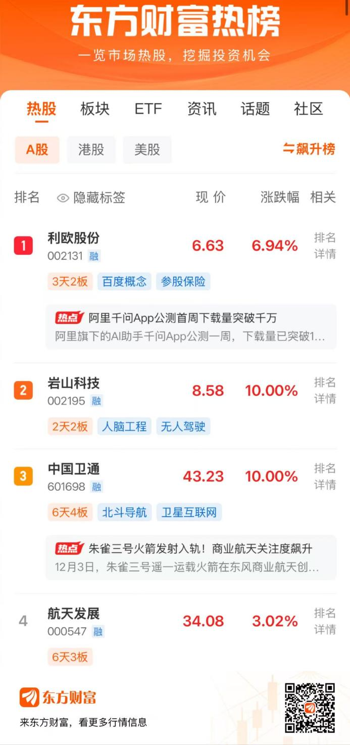 1月6日,两市震荡走高,上证指数领涨,收报4083.67点。东方财富热榜前四的股票中,利欧股份位列第1,岩山科技位列第2,中国卫通位列第3,航天发展位列第4。