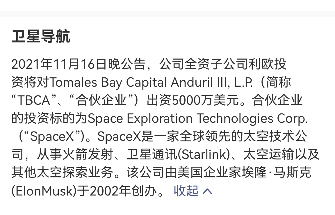 公司子公司投资马斯克SPaceX