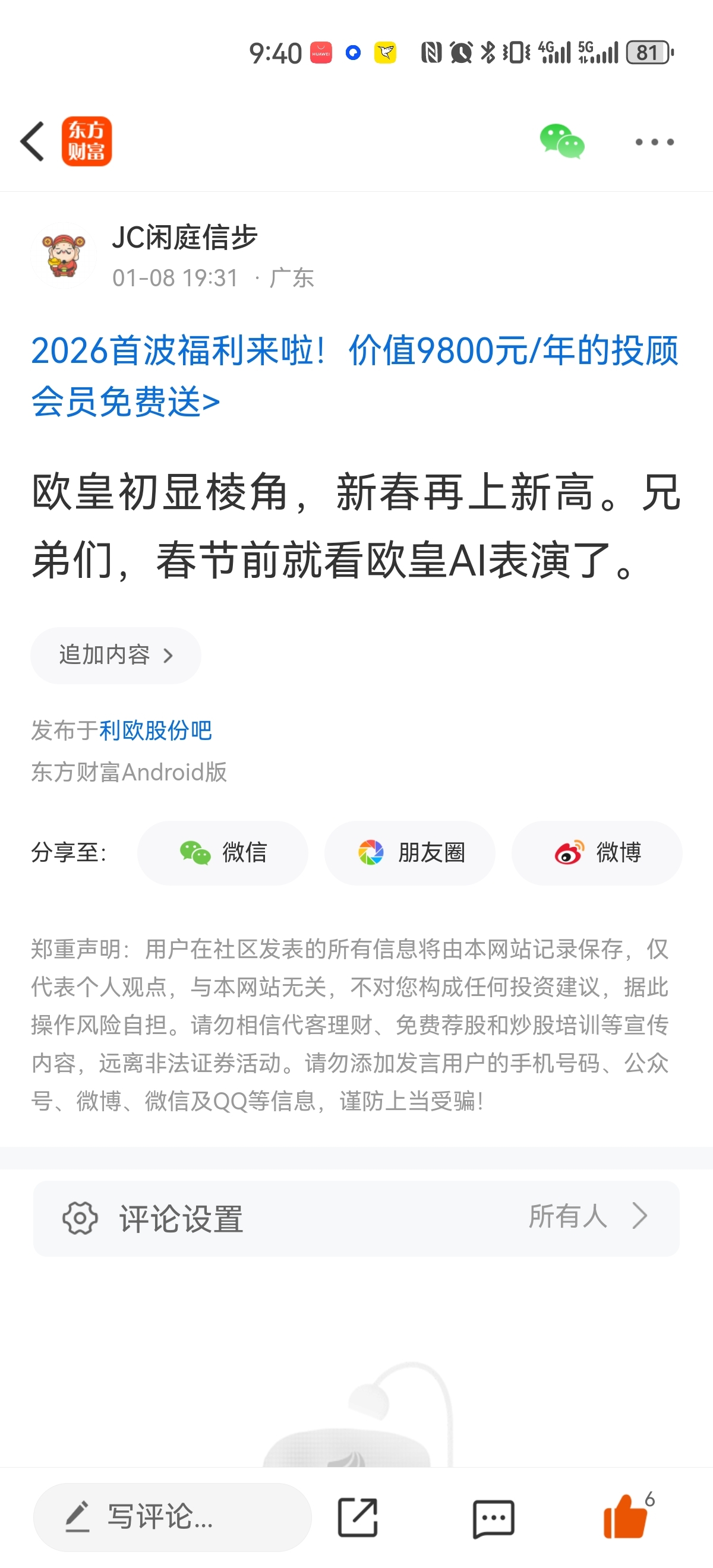 温馨提示: 1.根据《证券法》规定,禁止编造、传播虚假信息或者误导性信息,扰乱证券市场;2.用户在本社区发表的所有资料、言论等仅代表个人观点,与本网站立场无关,不对您构成任何投资建议。用户应基于自己的独立判断,自行决定证券投资并承担相应风险。《东方财富社区管理规定》