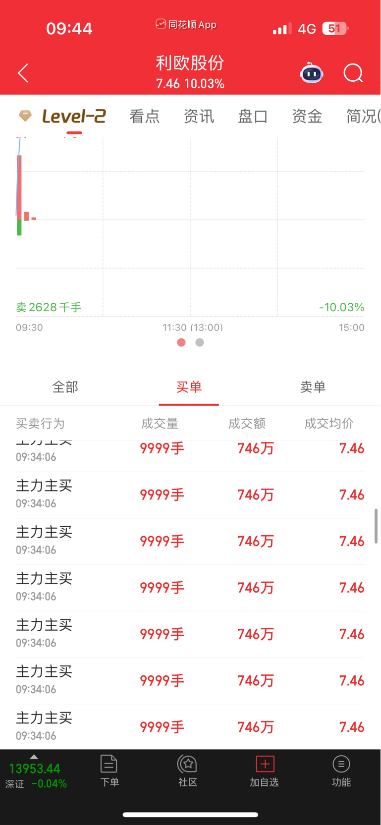 利欧直接秒板秒,44笔万手大单,下周一字走加速