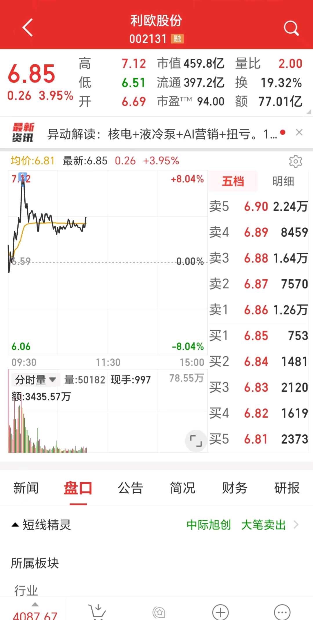 $利欧股份(SZ002131)$ $航天电子(SH600879)$ 这两天运气不太好,昨天卖了利欧去了岩山,折东墙补西墙