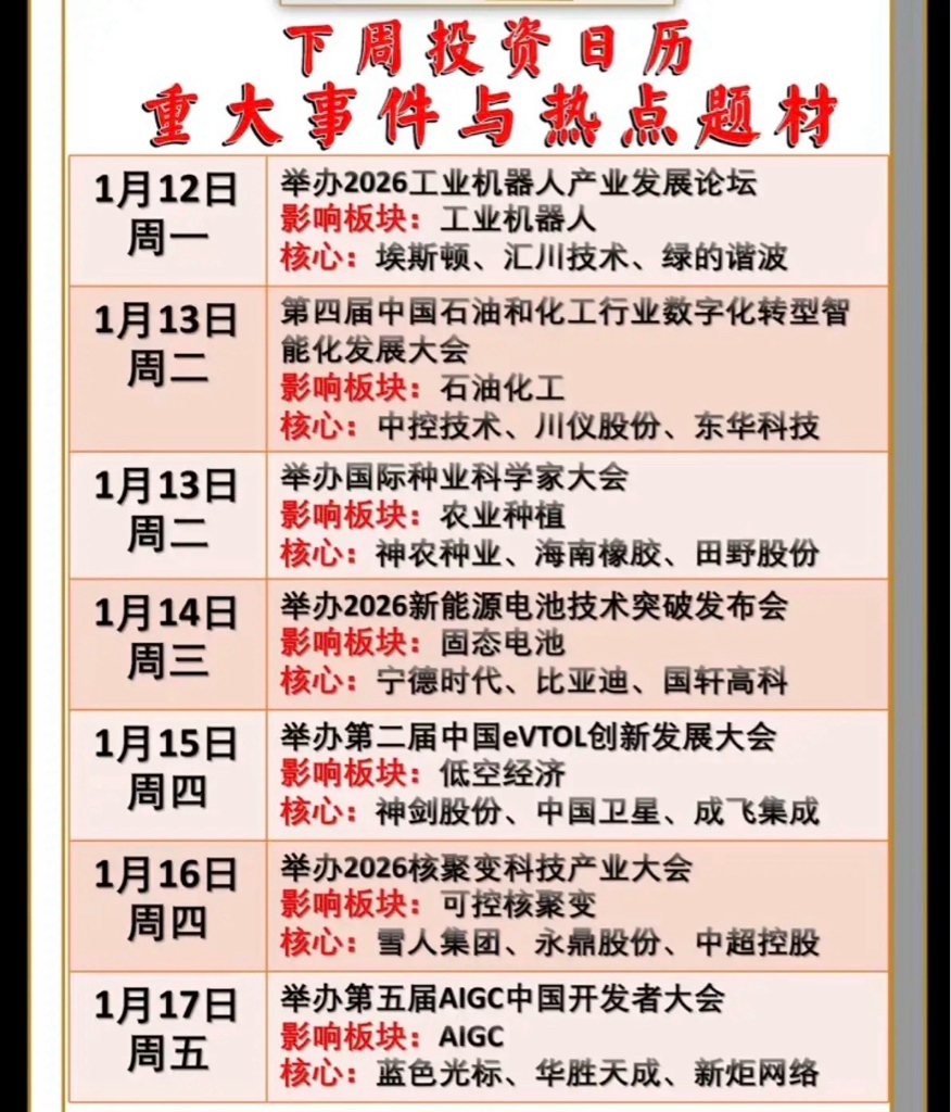 1.10周六下周财经热点事件前瞻!(1.12~1.17)关联题材1.工业机器人2