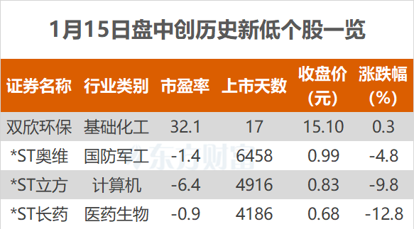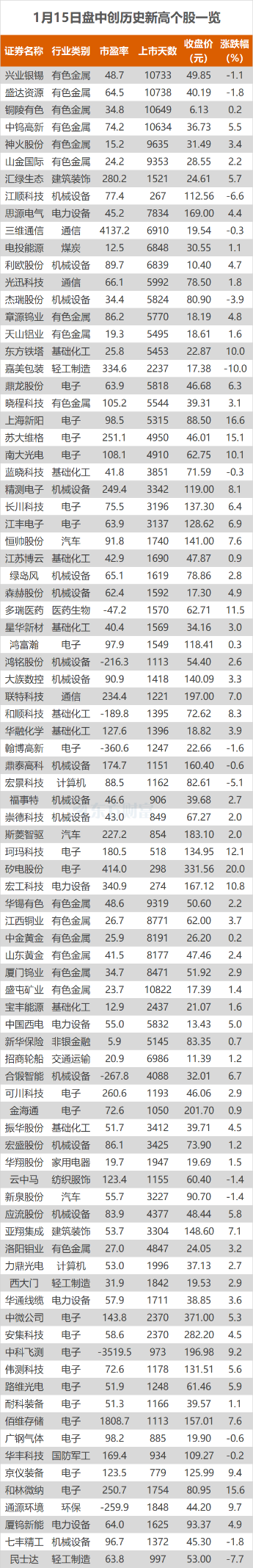 1月15日,A股三大指数今日涨跌不一,截止收盘,沪指跌0.33%,收报4112.60点;深证成指涨0.41%,收报14306.73点;创业板指涨0.56%,收报3367.92点。东方财富Choice数据显示,今日有87只个股盘中股价创历史新高,分别为利欧股份、三维通信等。