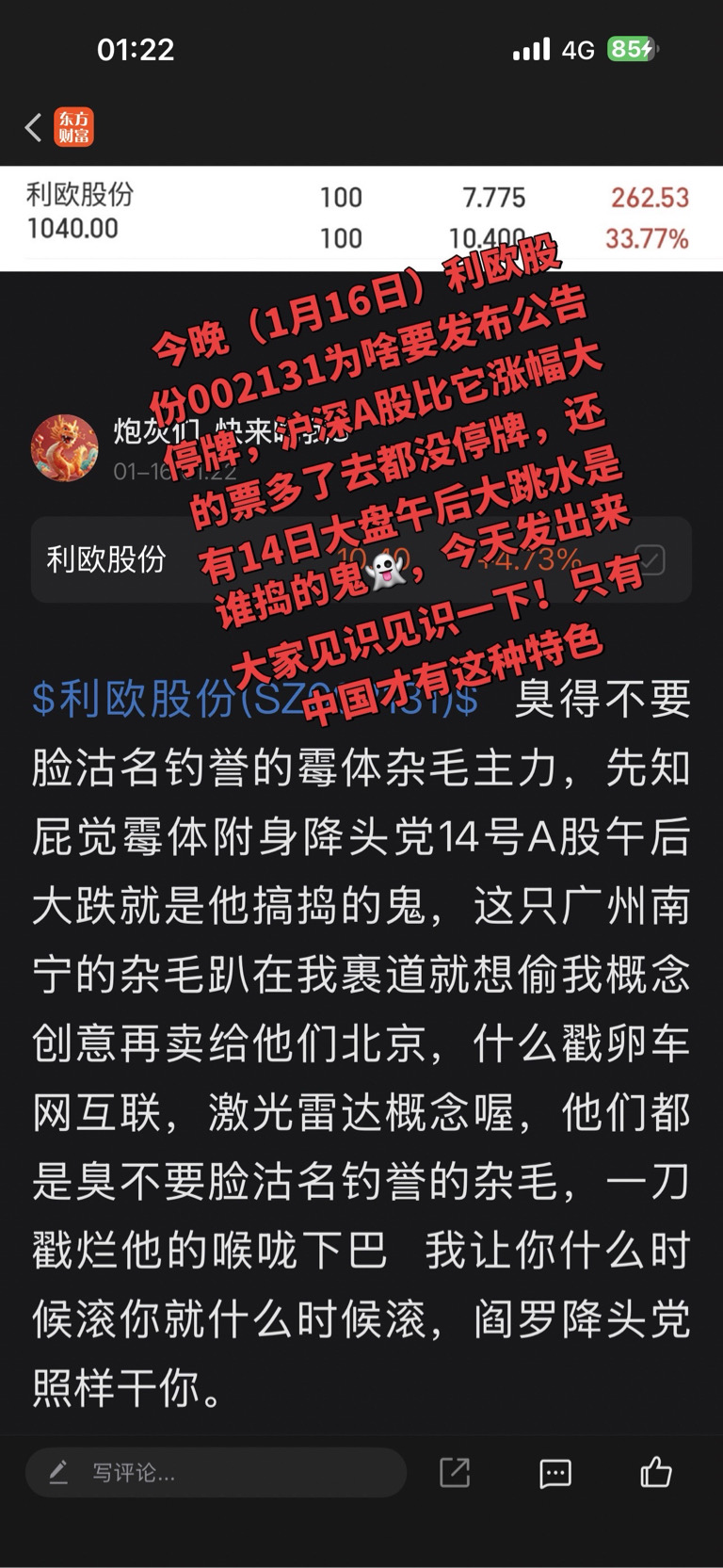 温馨提示: 1.根据《证券法》规定,禁止编造、传播虚假信息或者误导性信息,扰乱证券市场;2.用户在本社区发表的所有资料、言论等仅代表个人观点,与本网站立场无关,不对您构成任何投资建议。用户应基于自己的独立判断,自行决定证券投资并承担相应风险。《东方财富社区管理规定》