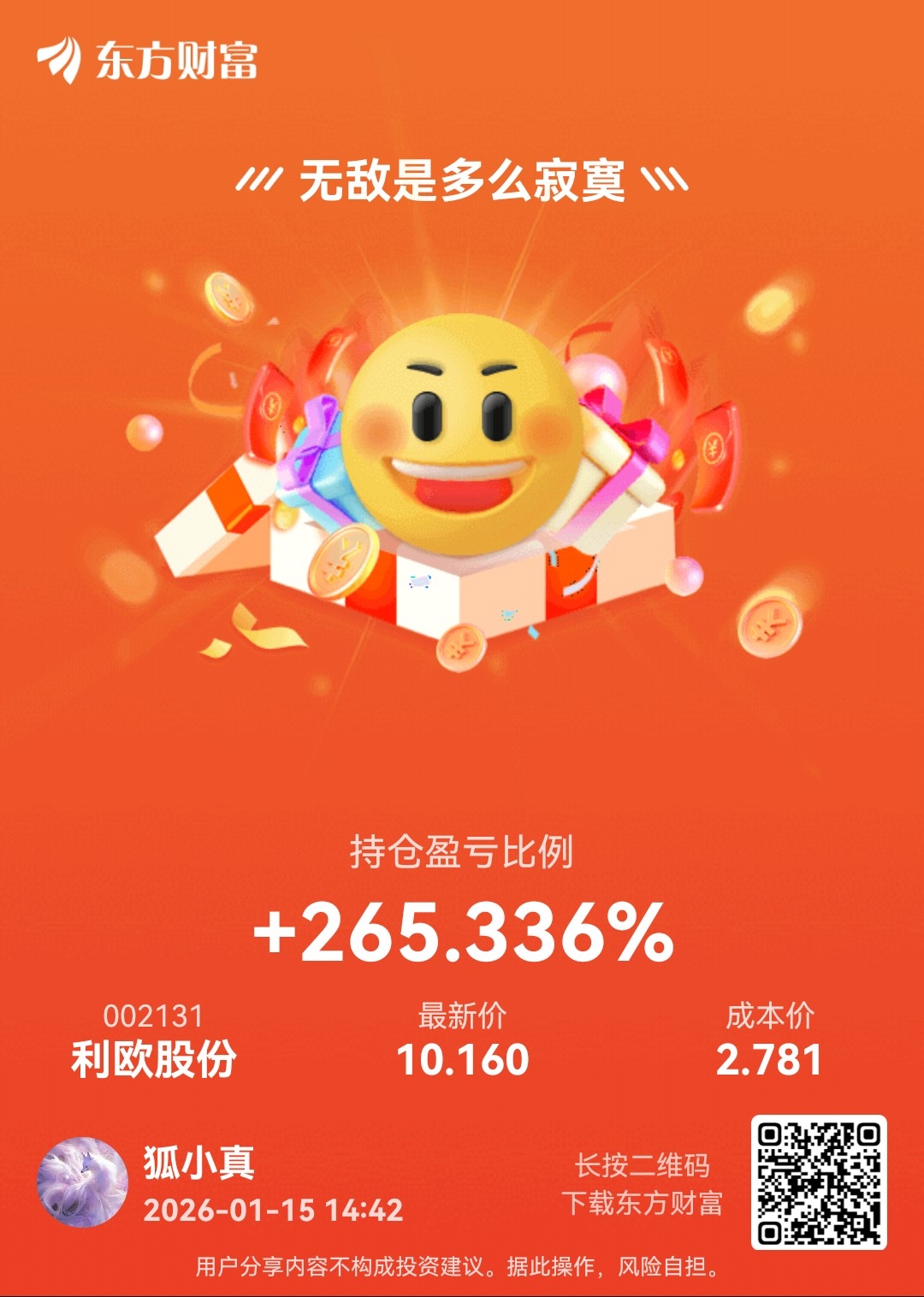 温馨提示: 1.根据《证券法》规定,禁止编造、传播虚假信息或者误导性信息,扰乱证券市场;2.用户在本社区发表的所有资料、言论等仅代表个人观点,与本网站立场无关,不对您构成任何投资建议。用户应基于自己的独立判断,自行决定证券投资并承担相应风险。《东方财富社区管理规定》