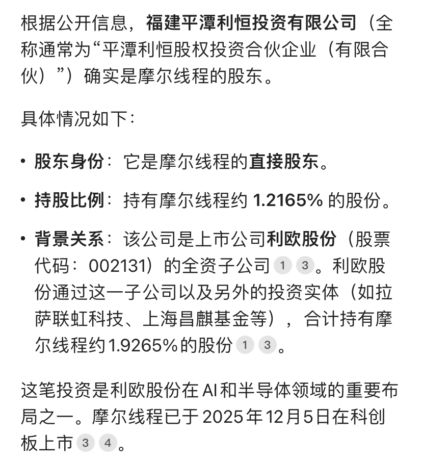 这是真的吗?利欧股份还持有摩尔线程几十亿的股份?有懂行的人,可以说一下吗?