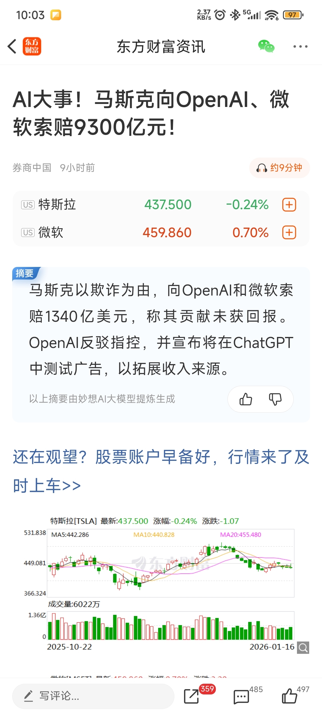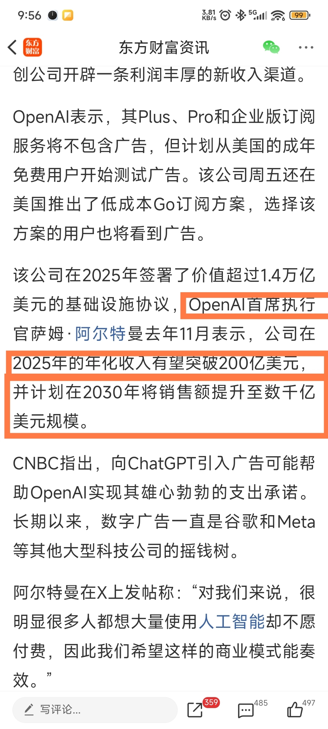 1月16日,OpenAI宣布将首次在ChatGPT测试广告以拓展收入。同日,联合创始人马斯克以“构成欺诈”为由,向OpenAI及微软索赔1340亿美元(约9300亿元),主张自身早期3800万美元种子资金应获相应估值收益。#投资干货#