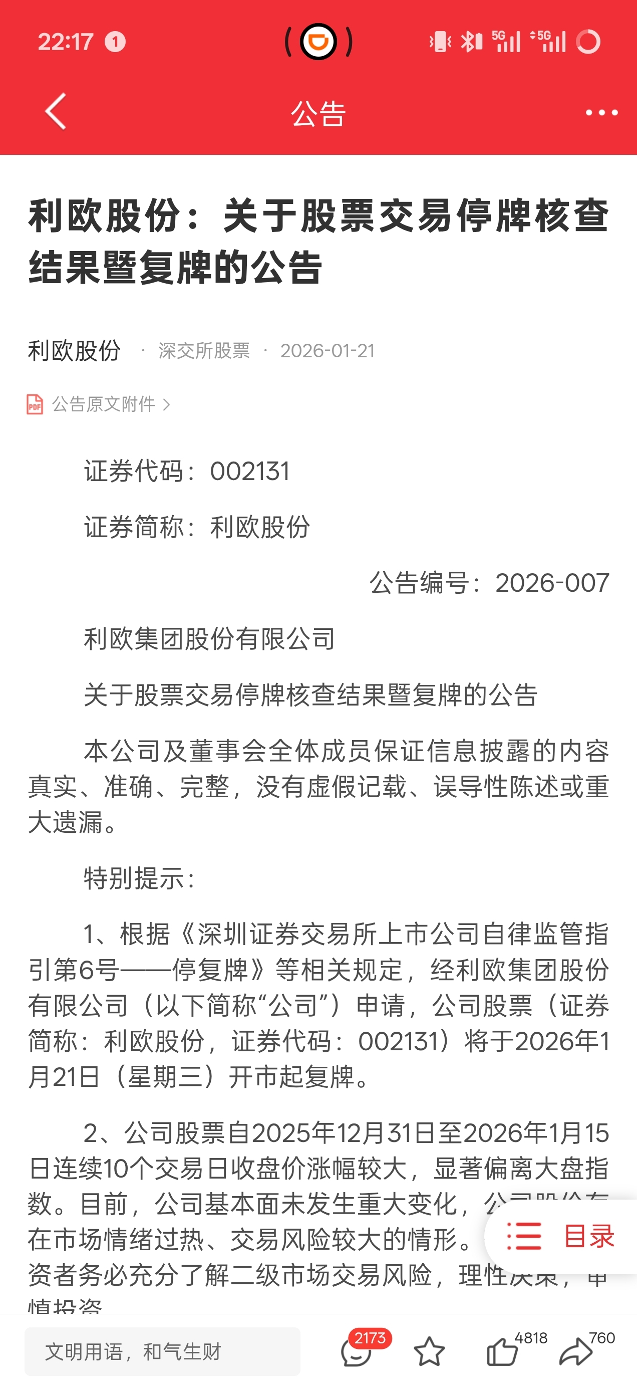 利欧股份明天复牌,看了下公告感觉还是偏利好一些,AI方向今天开始有资金热场,浙文互联集合竞价加封顶一字板开盘,志特新材也在盘中涨停创历史新高,近期高位股因利欧股份的特停加速下杀,希望明天的复牌能有超预期的表现来带动短线的修复情绪。$利欧股份(SZ002131)$ $浙文互联(SH600986)$ $志特新材(SZ300986)$