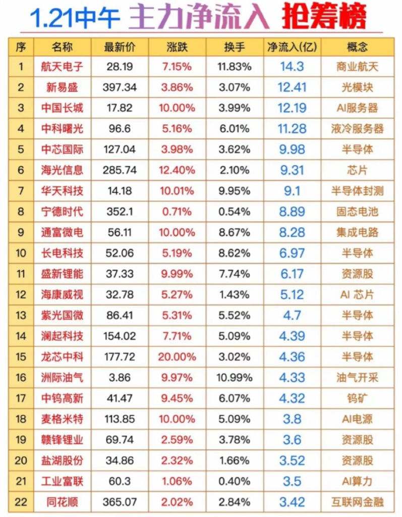 1.21午评:主力净流入抢筹榜,哪些股票值得关注?科技股强势领涨,主力抢筹航天电