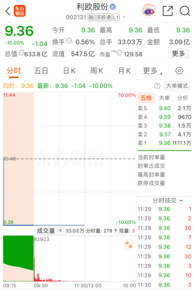 盘口数据呈现极端失衡:卖一至卖五队列全是巨量挂单,而买一至买五均为零申报,全天股价被死死钉在9.36元的跌停价,振幅为0%。即便盘中有3.09亿元资金尝试撬板,但在1177万手封单面前无异于杯水车薪,仅占封单金额的2.8%,根本无法撼动跌停板的牢固防线。更具讽刺意味的是,有股民因慌乱操作将“卖出”点成“买入”,在股吧引发数千条热议,成为这场崩盘的悲情注脚。