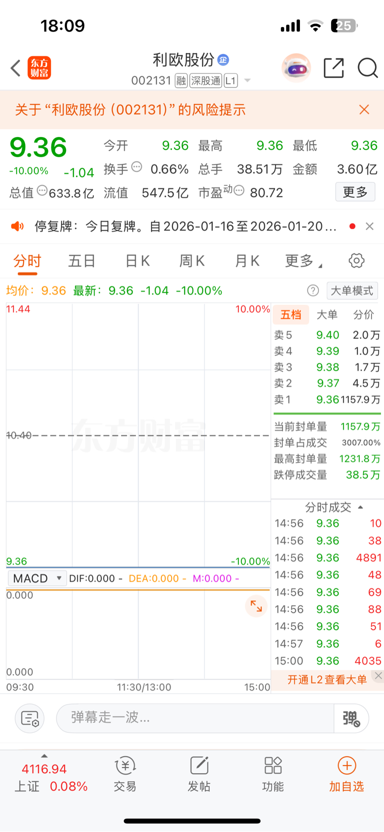 $利欧股份(SZ002131)$ 没见过如此大的压单,利欧股份9.36元的股价压单1200万手,竞价被吃掉一些,依然高达1157万手,这很明显是报复打击陈小群群体的,眼红它带队赚钱。陈小群就是散户的神,散户跟着穿越火线,即便是枪林弹雨。时代变了,这个陈小群退出,还会有下一个李小群、马小群,信息化时代,经济弱周期,全民炒股,能人倍出,不信等着瞧吧。