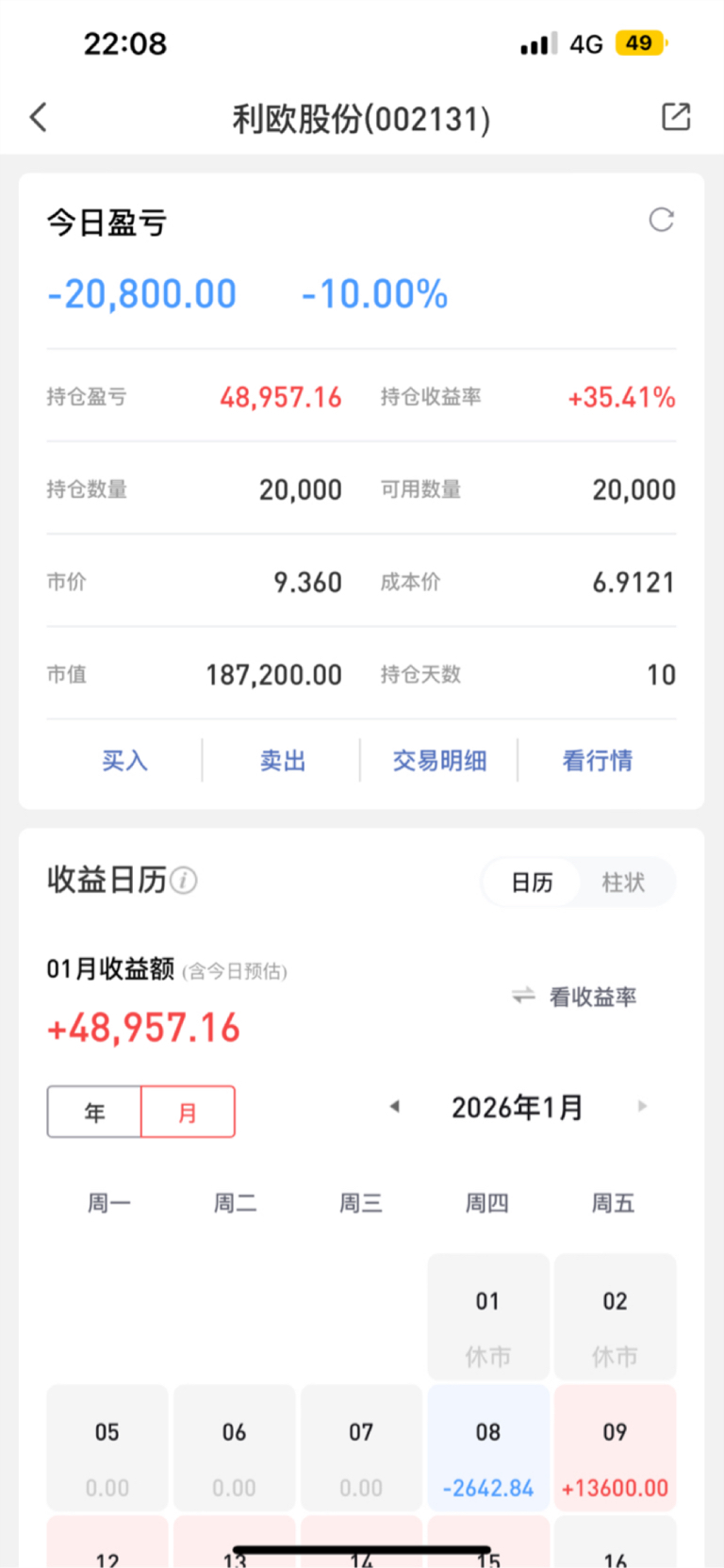 $利欧股份(SZ002131)$ 从利欧小黑屋后,连绿4天,账户断崖式缩水,但是没啥大不了,这个月还有37个点收益。利欧还有35个点收益。没有啥大不了,没有啥大不了。今日清仓其他股票,就等利欧开板就冲进去,春节前就只干利欧