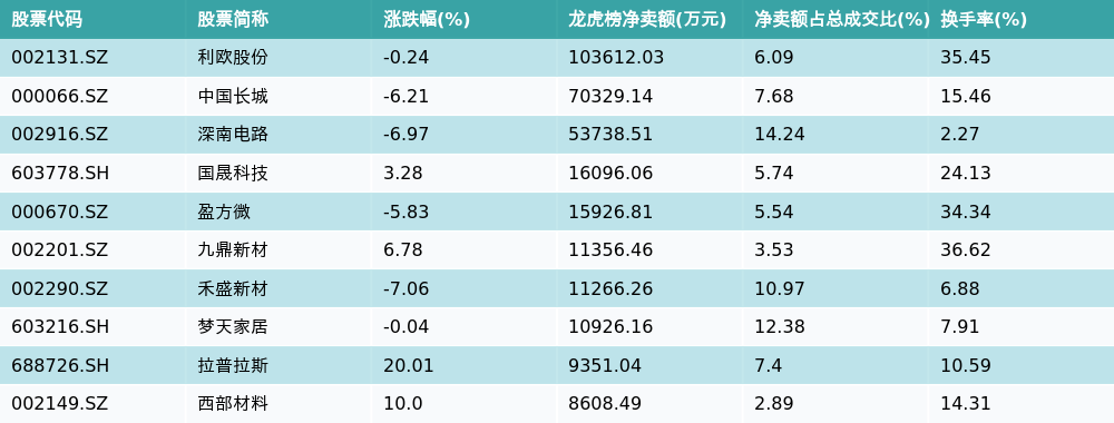 南财智讯1月23日电,南财金融终端数据显示,因当日异动登上龙虎榜的个股中,龙虎榜中资金净流出最多的前三位分别是利欧股份(002131.SZ)、中国长城(000066.SZ)与深南电路(002916.SZ)。其中排名第一的利欧股份被净卖出10.36亿元,占总成交金额的6.09%。利欧股份收盘下跌0.24%,换手率为35.45%。净卖出额前10个股详情见下图: