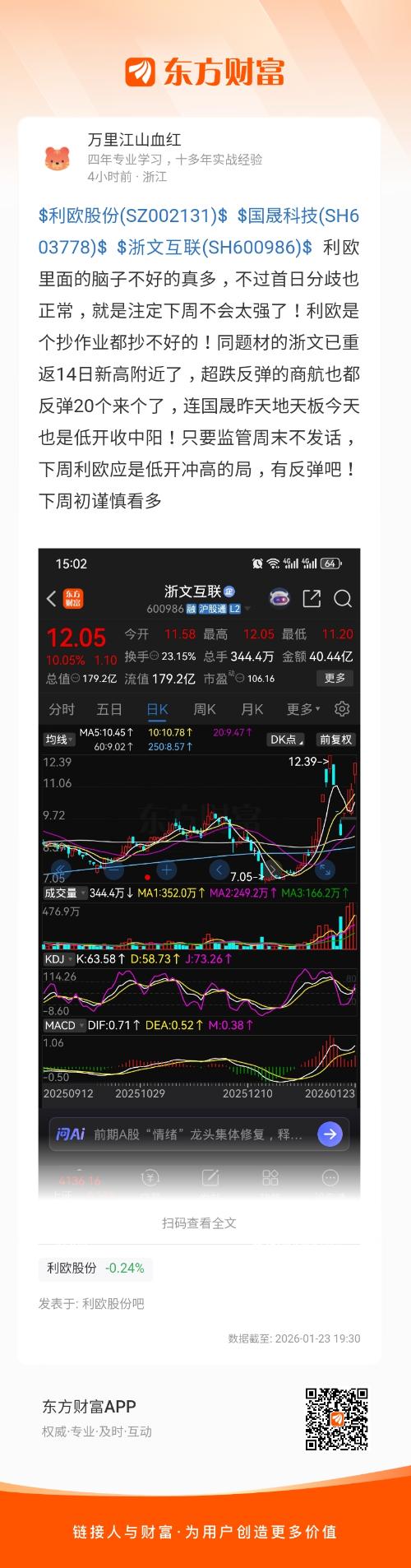 $利欧股份(SZ002131)$ $国晟科技(SH603778)$ $浙文互联(SH600986)$ 利欧里面的脑子不好的真多,不过首日分歧也正常,就是注定下周不会太强了!利欧是个抄作业都抄不好的!同题材的浙文已重返14日新高附近了,超跌反弹的商航也都反弹20个来个了,连国晟昨天地天板今天也是低开收中阳!只要监管周末不发话,下周利欧应是低开冲高的局,有反弹吧!下周初谨慎看多