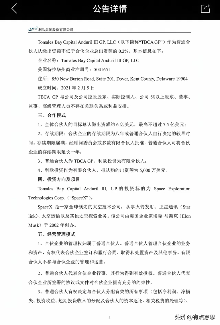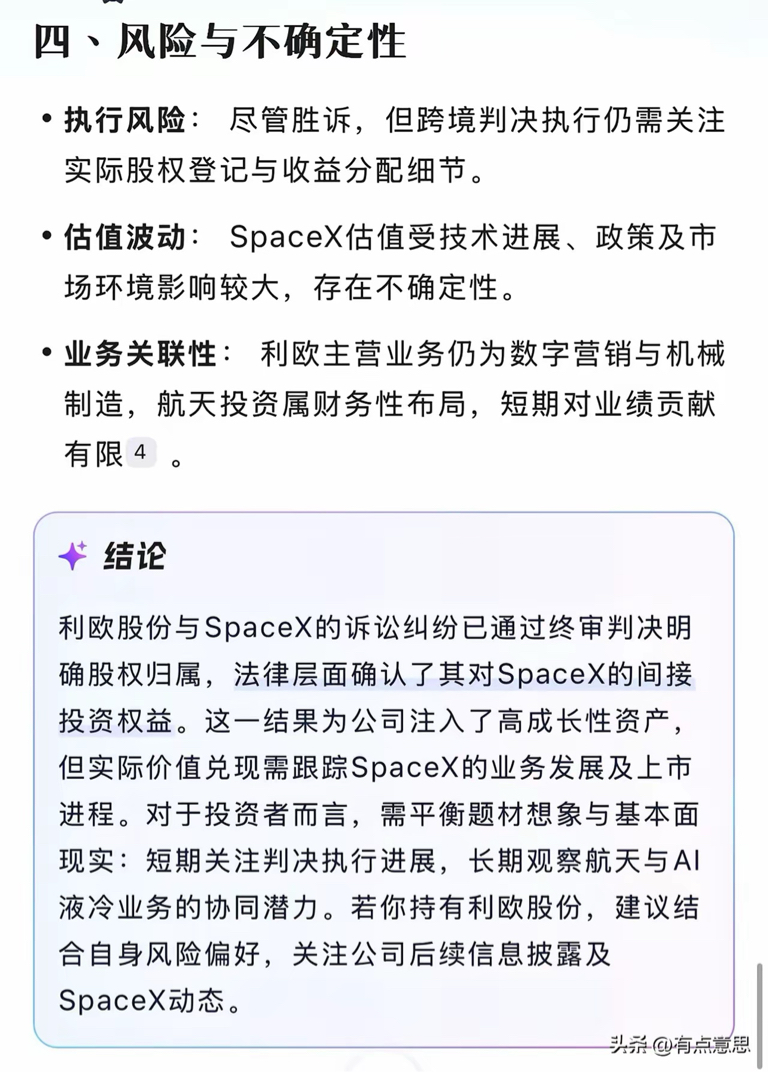 利欧这波是要炸天。1月23号美国当地法院确认了利欧股份对SpaceX投资持有股