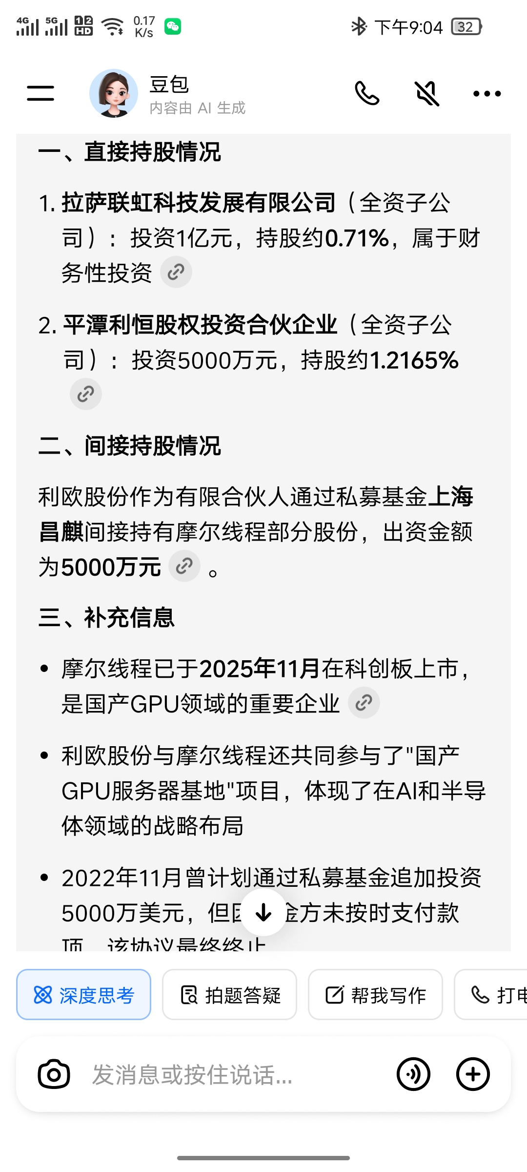 $利欧股份(SZ002131)$ 利欧持有摩尔线程,都赚了50亿了。虽然要三年后才能减持