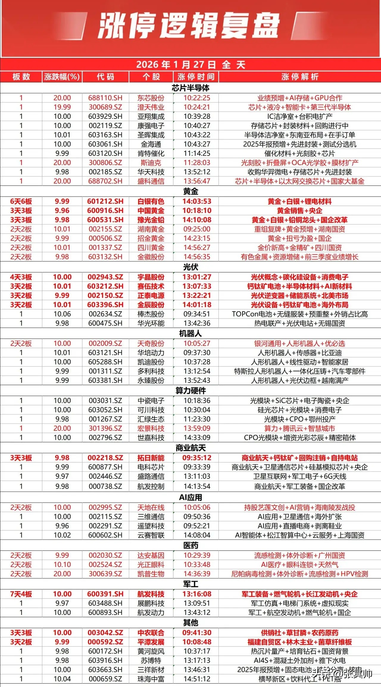 1月27号,全天涨停榜,最大特点是Ai产业链活跃,如,Ai硬件,Ai应用,芯片半