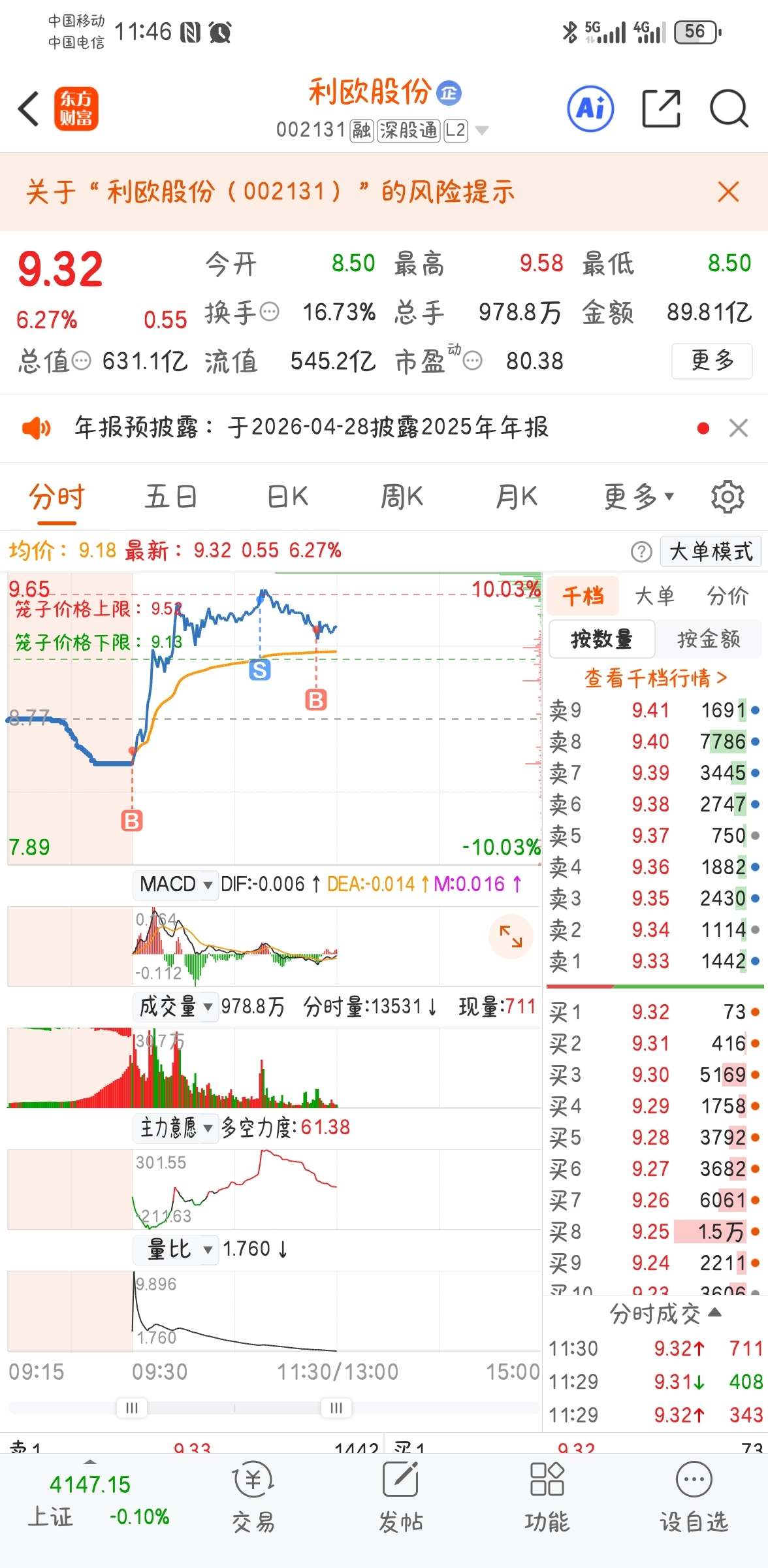 $利欧股份(SZ002131)$ 今天拉涨停的概率应该不大,上下震荡,可以做做 T ,毕竟明天才出监管,趋势还是向上,信的话,继续看多吧!