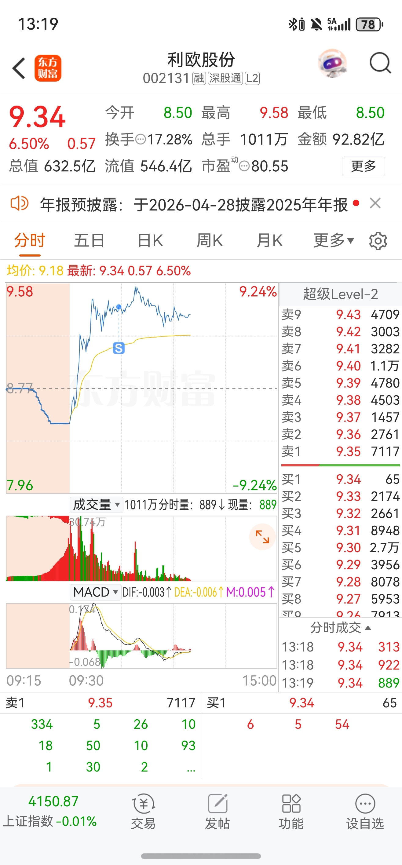 $利欧股份(SZ002131)$ 跟昨天一样,我看好你,但是我还是坚定自我落袋为安。今日收盘应该会在9.40上下不会两分