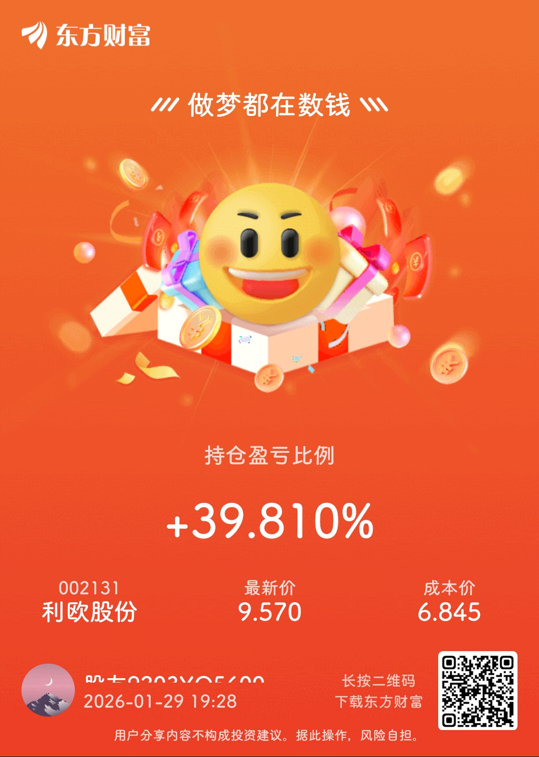 温馨提示: 1.根据《证券法》规定,禁止编造、传播虚假信息或者误导性信息,扰乱证券市场;2.用户在本社区发表的所有资料、言论等仅代表个人观点,与本网站立场无关,不对您构成任何投资建议。用户应基于自己的独立判断,自行决定证券投资并承担相应风险。《东方财富社区管理规定》