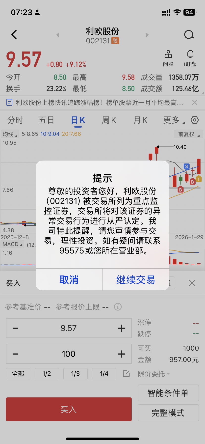 $利欧股份(SZ002131)$ 兄弟们,利欧续杯了吗?为什么我的交易软件挂买还有风险提示?