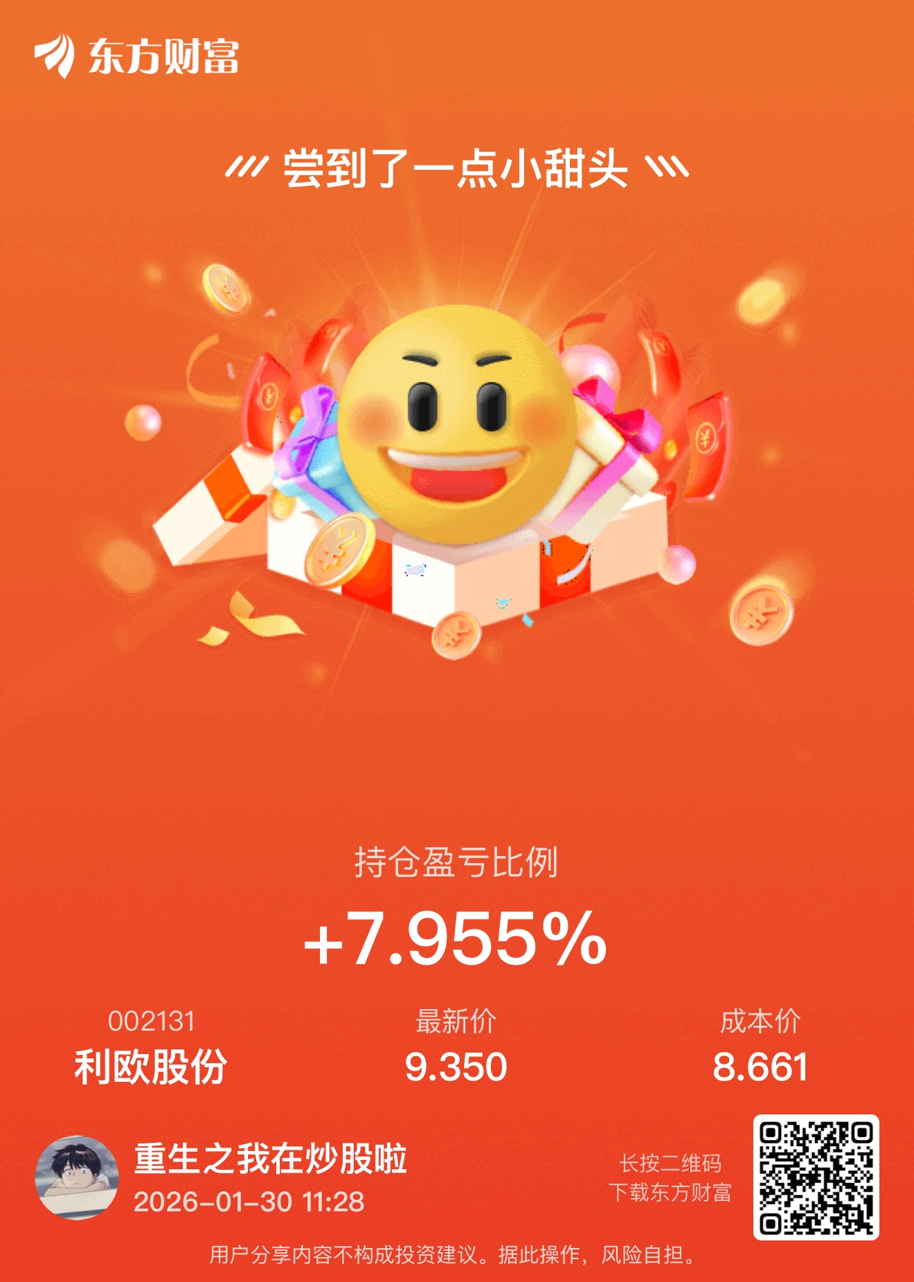 温馨提示: 1.根据《证券法》规定,禁止编造、传播虚假信息或者误导性信息,扰乱证券市场;2.用户在本社区发表的所有资料、言论等仅代表个人观点,与本网站立场无关,不对您构成任何投资建议。用户应基于自己的独立判断,自行决定证券投资并承担相应风险。《东方财富社区管理规定》