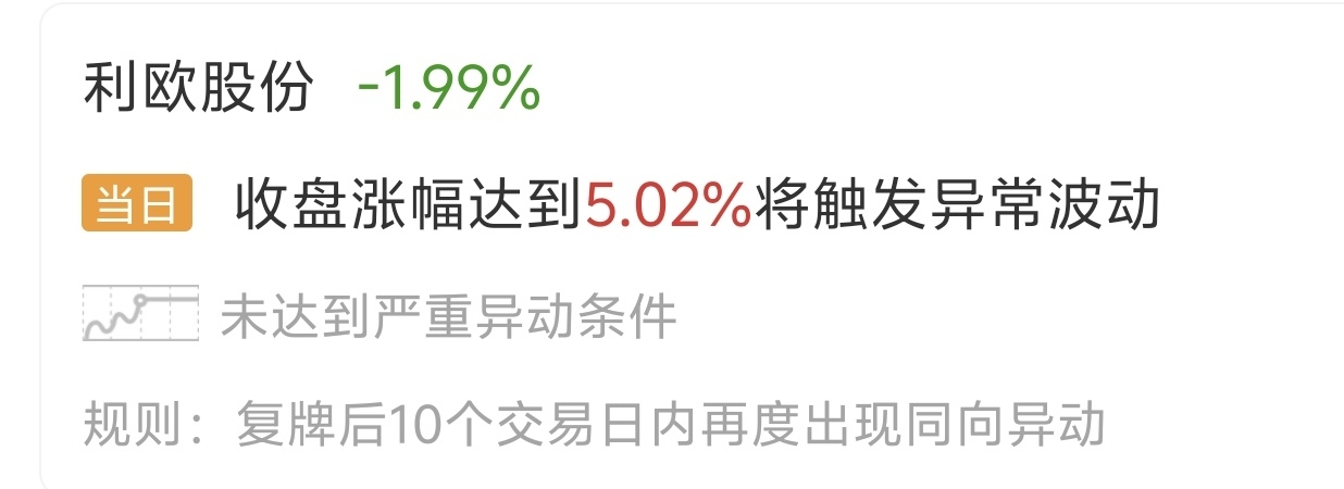 $利欧股份(SZ002131)$ 控控异动挺好的,顺便洗洗盘,一次没事儿,触发多了肯定不稳妥,给后面两天留点空间,省的让人揪小辫子