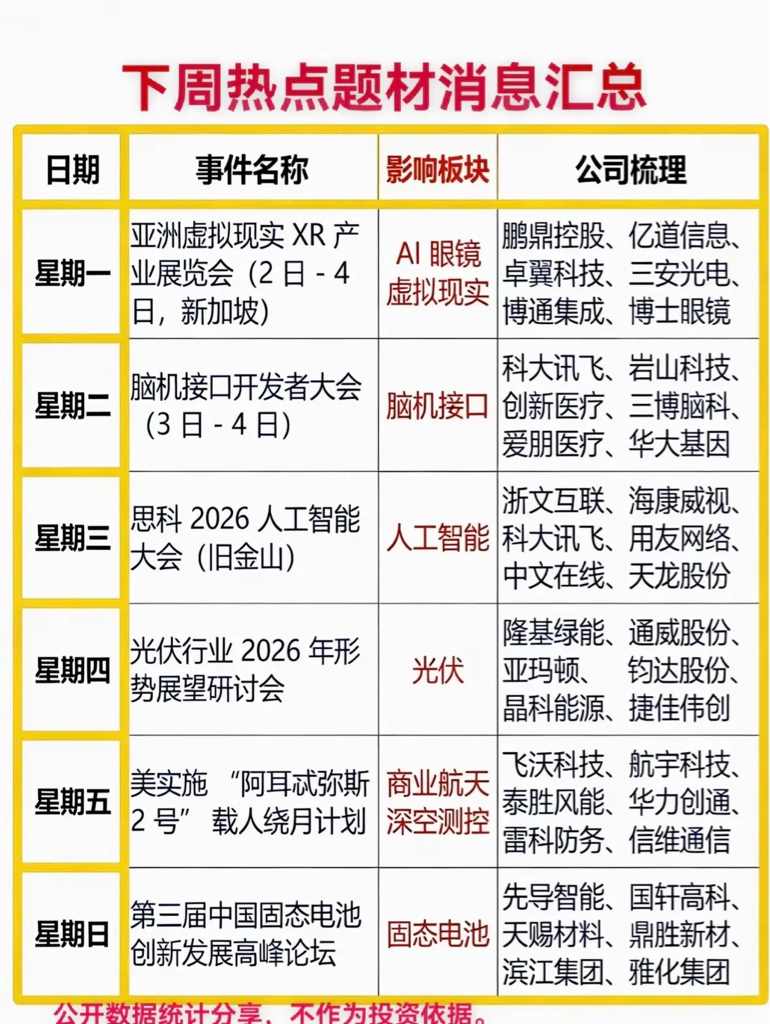 2月2日下周热点:虚拟现实展、脑机接口会、AI大会、光伏研讨、商业航天计划、固态电池论坛,涉及多领域龙头公司。$利欧股份(SZ002131)$ $白银有色(SH601212)$ #社区牛人计划#