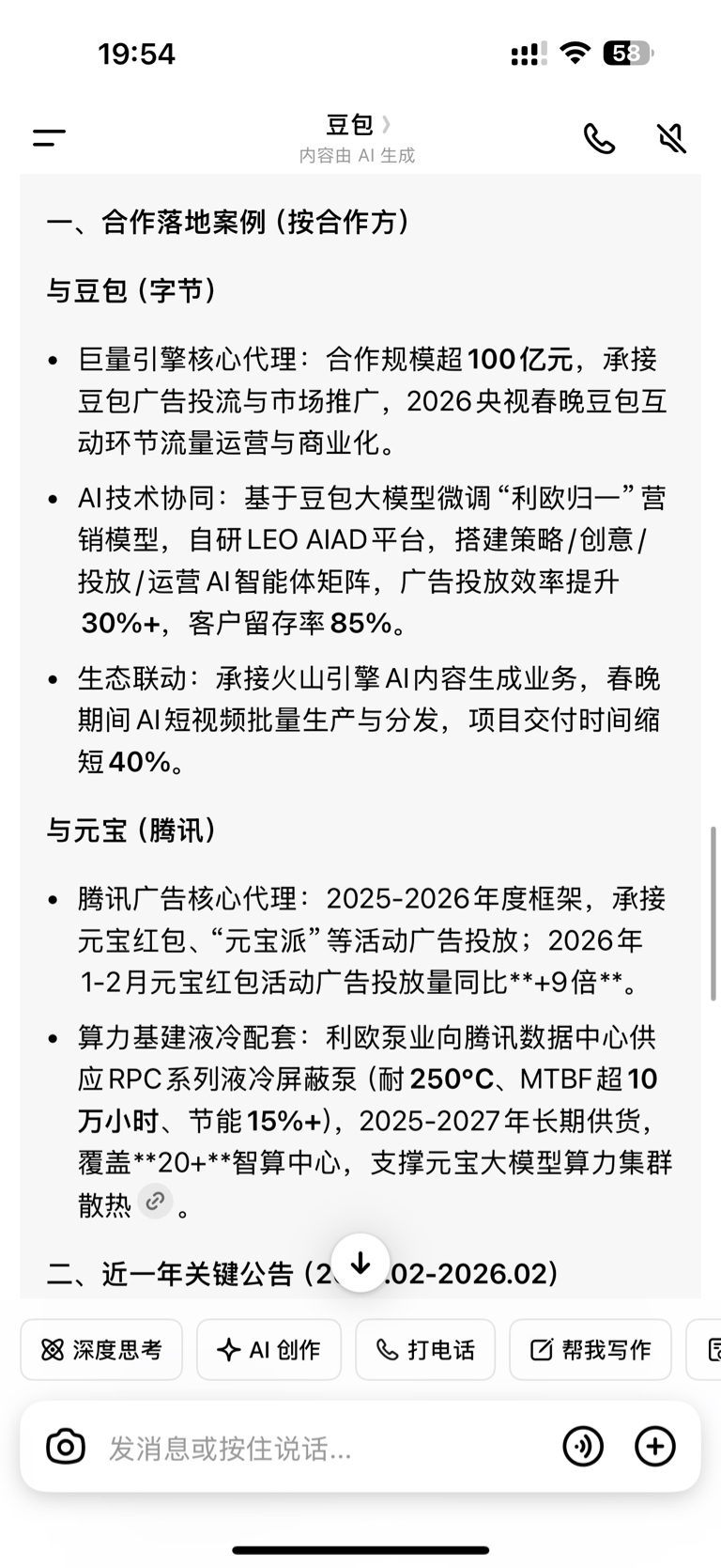 元宝2026红包开始了,利欧有合作。2026年央视春晚豆包的互动也是利欧合作,长