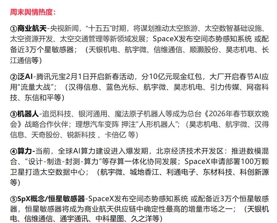 这个周末,外围贵金属继续暴跌,并且史诗级暴跌,那么这里下周贵金属上来也是继续按地板的节奏,唯一变数就是这边的化工方向能否走独立,但不确定性也较大。周五盘后,中际和新易盛业绩炸裂,新易盛预计净利润94亿元-99亿元,增长幅度为2.31倍至2.49倍。那么这里周一就看是否有资金去做他的高举高打。但同时也有部分核心票的业绩严重不及预期:航天发展预计2025年净亏损10亿元-16.5亿元。同时周末商业航天这边SpaceX计划部署100万颗卫星!那么这里就要看周一航天的相关有逻辑的品种能否主动走强带队领涨了。