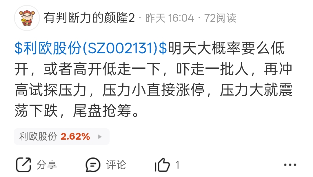 温馨提示: 1.根据《证券法》规定,禁止编造、传播虚假信息或者误导性信息,扰乱证券市场;2.用户在本社区发表的所有资料、言论等仅代表个人观点,与本网站立场无关,不对您构成任何投资建议。用户应基于自己的独立判断,自行决定证券投资并承担相应风险。《东方财富社区管理规定》