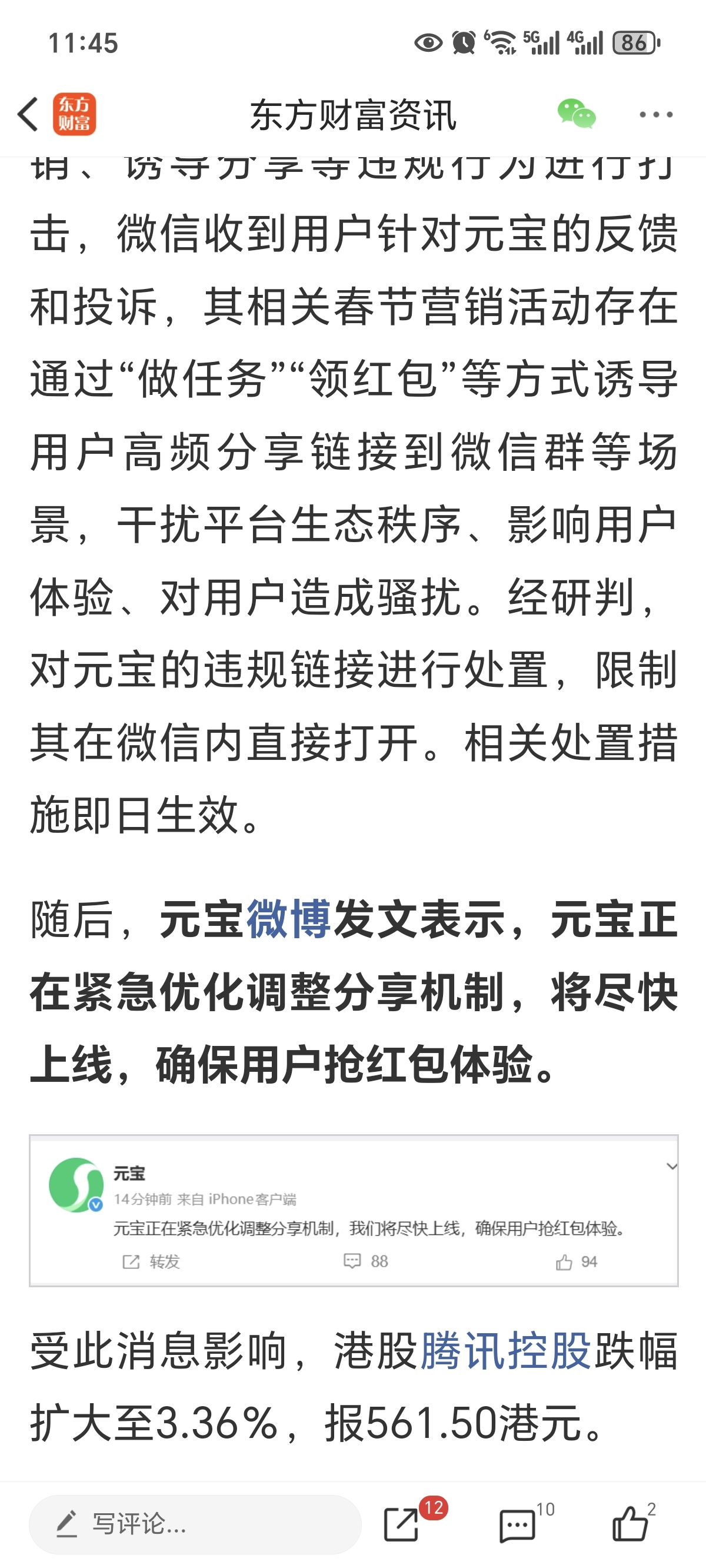 一早上了我才看到利空,腾讯封杀元宝,窝里斗!