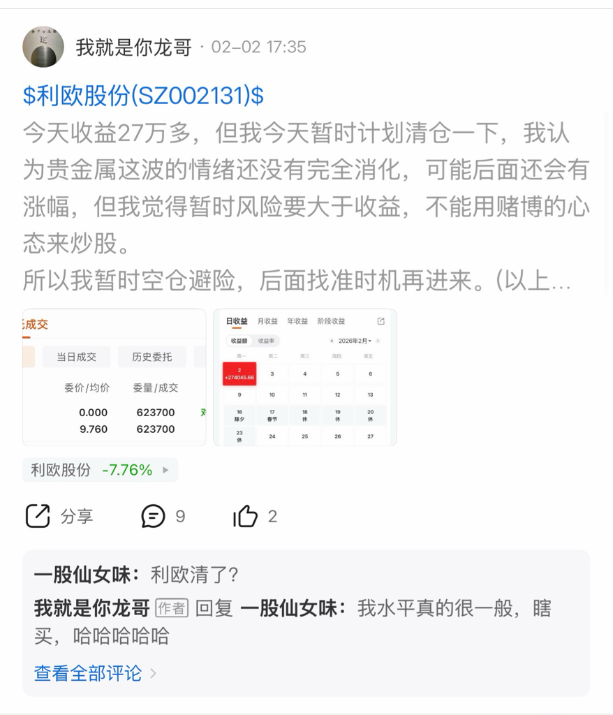 我前天提前清仓了600多万利欧股份,我当时还说了清仓的逻辑,竟然完全验证了,还挺